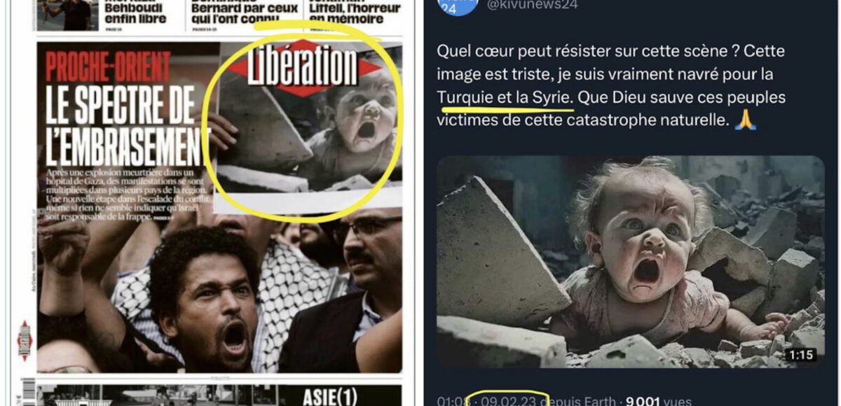 Libération a publié sur sa couverture une photo de manifestant brandissant un faux bébé de Gaza généré par l’Intelligence artificielle. Le directeur de la publication du quotidien concède seulement qu’il aurait « probablement fallu mentionner en légende le fait que l’homme sur la vraie photo brandissait une fausse image ».